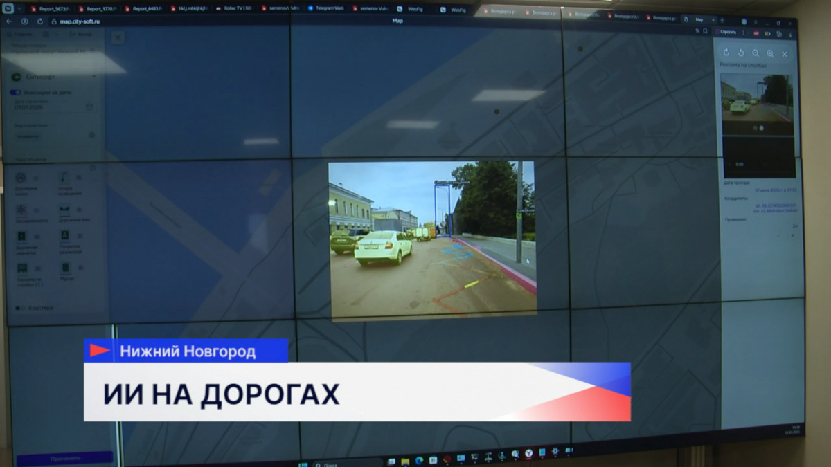 Улица Минина. На экране отображаются проблемы состояния дорожной инфраструктуры центральной улицы города, отследить которые помогла нейросеть. Пилотный проект запущен в Нижнем Новгороде, Кстове, Дзержинске, Семенове, Арзамасе и Красных Баках. Контроль ведется с помощью программно-аппаратных комплексов видеофиксации и аналитики данных в рамках проекта «Умный регион».