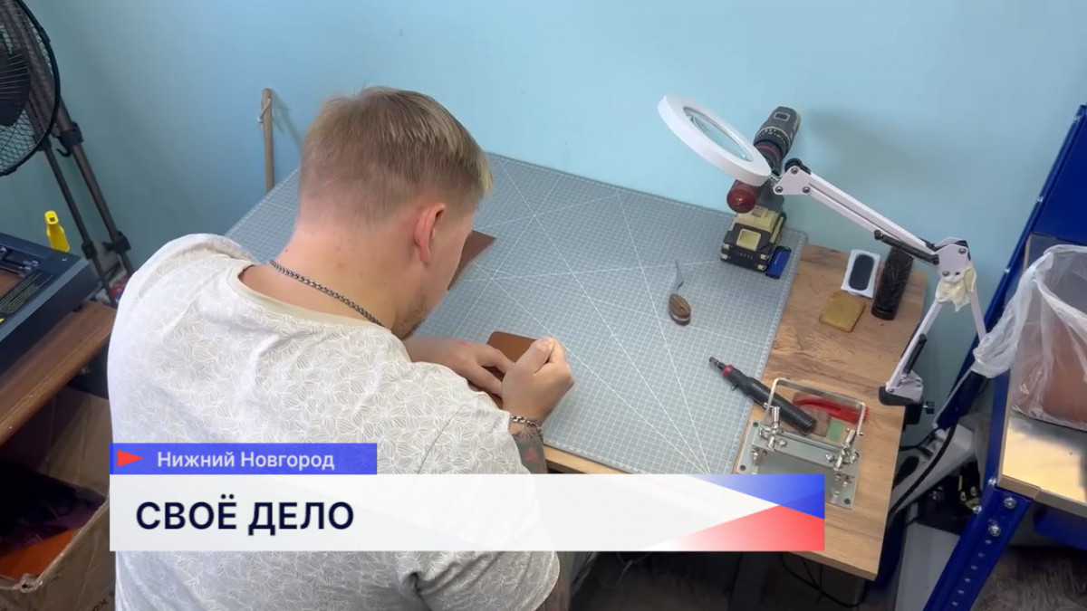 В мастерской Максима Мардаровского вовсю идёт творческий процесс: он трудится над созданием будущей обложки для паспорта. Перед ним — главный материал кожа, множество подручных инструментов: от ножниц и шила до станка для установки фурнитуры и лазерного гравера.