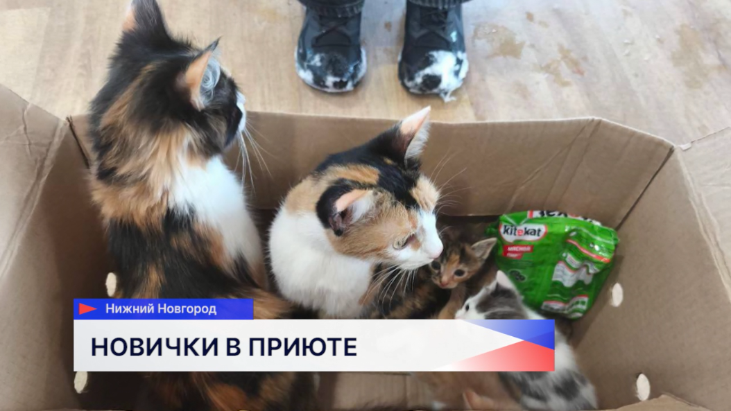 Две взрослые кошки и три котёнка. Это новые пушистые обитатели приюта «Сострадание НН».