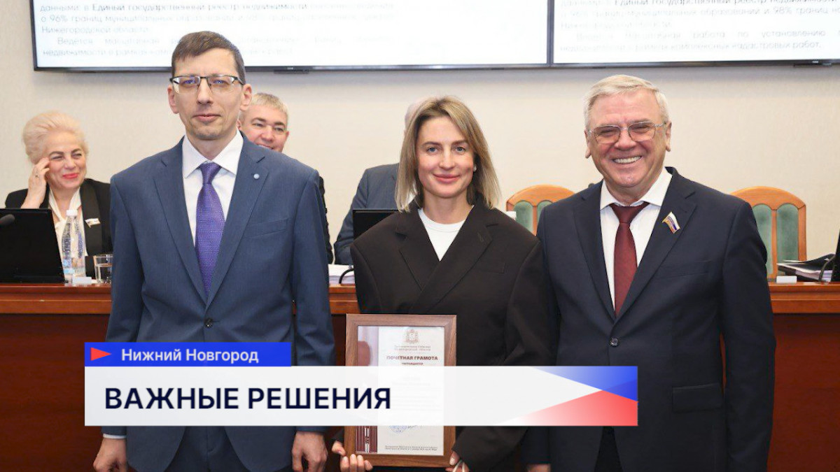 Председатель Законодательного Собрания Евгений Люлин и заместитель губернатора Егор Поляков в начале первого в этом году заседания регионального парламента награждают нижегородцев, внёсших значительный вклад в развитие региона. Руководитель Управления Росреестра по Нижегородской области Оксана Штейн удостаивается Почётной грамоты Законодательного Собрания за многолетний добросовестный труд и личный вклад в реализацию социально значимых проектов. Начальник Главного управления ФСИН России по Нижегородской области генерал-лейтенант внутренней службы Виктор Брант и министр внутренней, региональной и муниципальной политики Нижегородской области Павел Карасёв награждаются Почётными грамотами Нижегородской области.