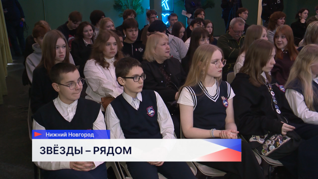 В главном зале Дома народного единства — юноши и девушки, учащиеся нижегородских школ. На встречу с ними приехали настоящие звёзды — прыгун с трамплина Денис Корнилов и двоеборец Артём Галунин.