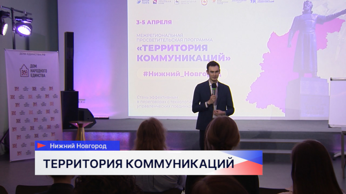 Региональный этап образовательной программы «Территория коммуникаций» стартовал в АНО «Дом народного единства» в Нижнем Новгороде. Цель проекта — повышение уровня коммуникативных навыков у молодёжи. Этапы программы проходят в 11 городах России.